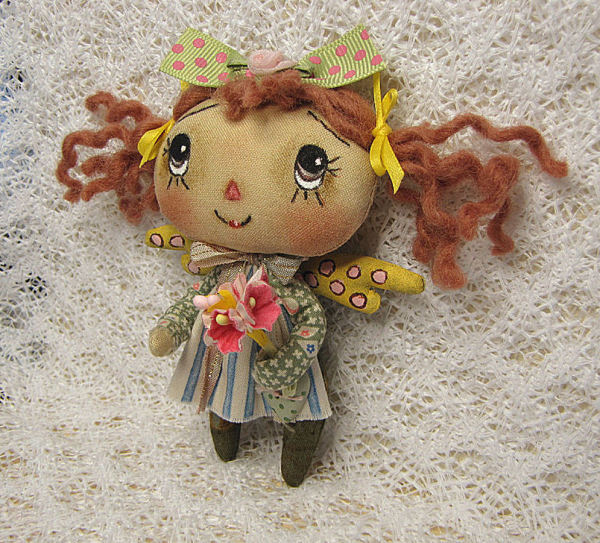 I redid Susie with little poseable arms and she is holding a little bouquet of pink milliner's flowers. I also added a green with pink polka dots bow to her head and topped it off with a little pink flower.